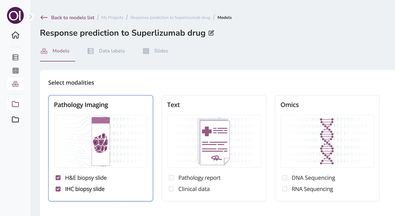 Powered by foundation models including CanvOI (co-developed with Oracle and trained on 1.5 million slides), OI Suite delivers high predictive power in small clinical cohorts. It enables no-code modeling, cohort enrichment, and early feasibility assessment leveraging multimodal AI and Real-World Data.
