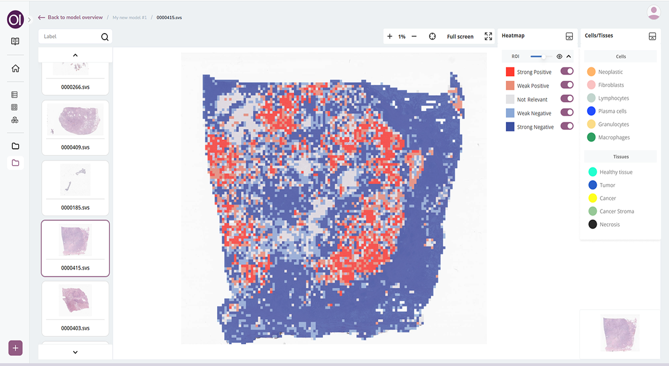 OI Suite translates complex multimodal AI into practical, intuitive tools that require no coding or AI expertise. Interactive heatmaps and cell-level visualizations trace predictions back to morphology, and biomarker insights allow researchers to generate and test hypotheses quickly and accelerate discovery.